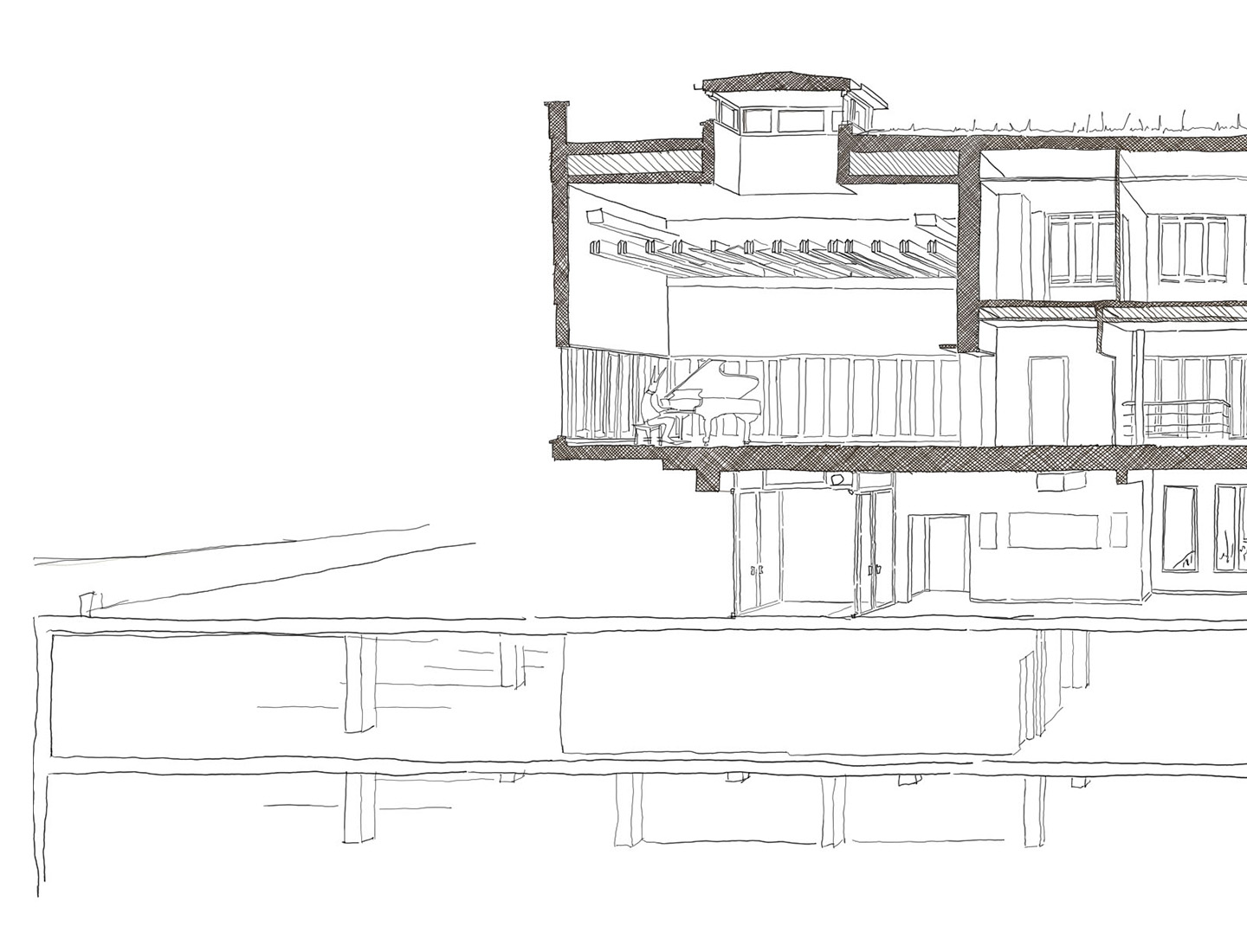L’entrée est au centre de l’ensemble moderne. Un volume la surplombe, il est tramé de bois et paré d’un lumineux calcaire qui rayonne au milieu du béton, exprime l’évolution des modes constructifs sans opposer les périodes. Cette console signale et protège à la façon d’un auvent. Elle est réalisée au premier étage dans le prolongement du bâtiment de bureaux préexistant. Elle contient et met en scène la salle de répétition de l’orchestre dont l’activité est perceptible à travers la baie basse qui court sur ses trois façades.