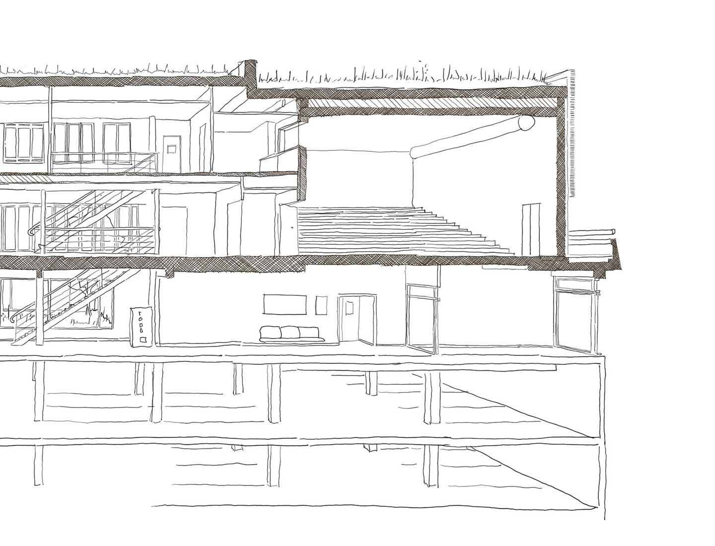 Initialement presque souterrain, le bâtiment se développe autour de deux patios, seul un pavillon d’entrée émerge. Du projet d’origine subsistent le socle en béton et l’organisation efficace.