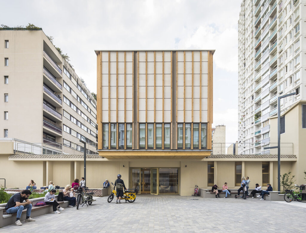 Utiliser le réemploi non pas pour « décorer » mais pour construire, c’est un cap difficile à passer. Les parements de l’équipement sont réalisés en matériaux réemployés. Un pavé de sol trouvé sur place, un parement calcaire récupéré via une plateforme.